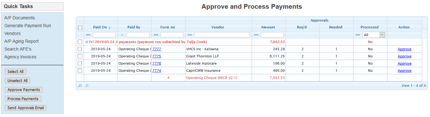 The Approve and Process Payments page will also list each payment and how it is to be paid (cheque, EFT, automatic withdrawal, etc.). The page will also indicate how many approvals are required (cheque signers, for example), and how many are still needed.