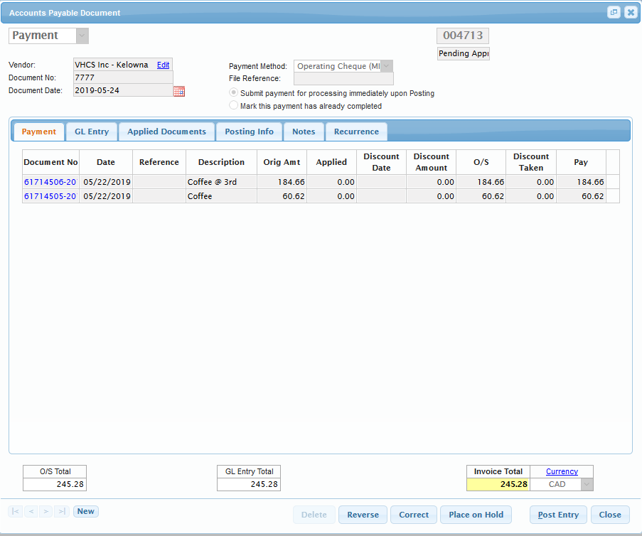 Note: if you do not set up authorized signing officers then any payments will be considered approved when posted and can be processed immediately by the accounts payable department. In this case any cheques will be printed without signatures and management will have to sign them physically. However, EFT payment files could be uploaded to the bank (and paid) without further authorization.