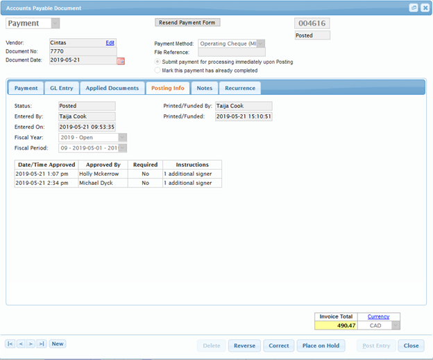 All invoices and payments are user, time and date stamped each time they are approved. To review these approvals open an accounts payable document (invoice, credit note, or payment) and then tap on the Posting Info tab.